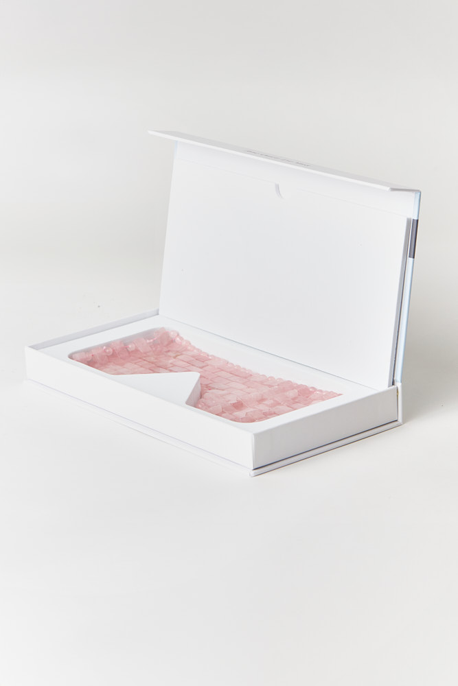 Rose quartz is inherently cool, which makes it soothing to the eyes and its heaviness induces a deep sense of relaxation and comfort. In combination with specific lymphatic drainage movements, it helps reduce dark circles and puffiness. I recommend applying it before meditation to calm your mind or to help you fall asleep.